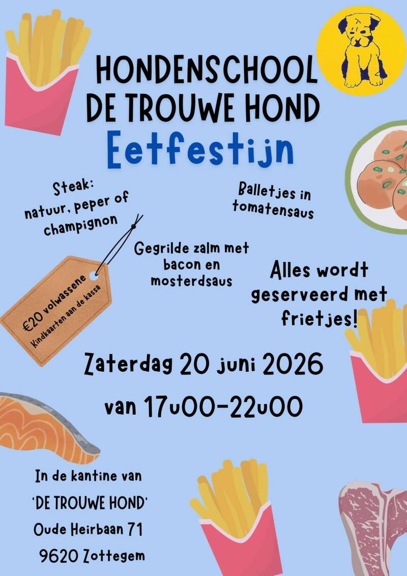 Jullie zijn meer dan welkom op zaterdag 20 juni 2026 van 17u00-22u00 in de kantine van de hondenschool.